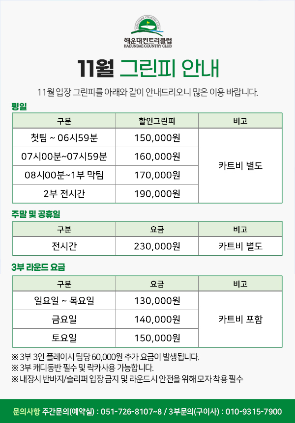 해운대컨트리클럽 부산광역시 기장군 정관면 병산2로 265 대표전화 : 051.726.8000 팩스 : 051.726.8001 사업자등록번호 : 621-81-14504 통신판매업신고 : 2009-부산기장-50